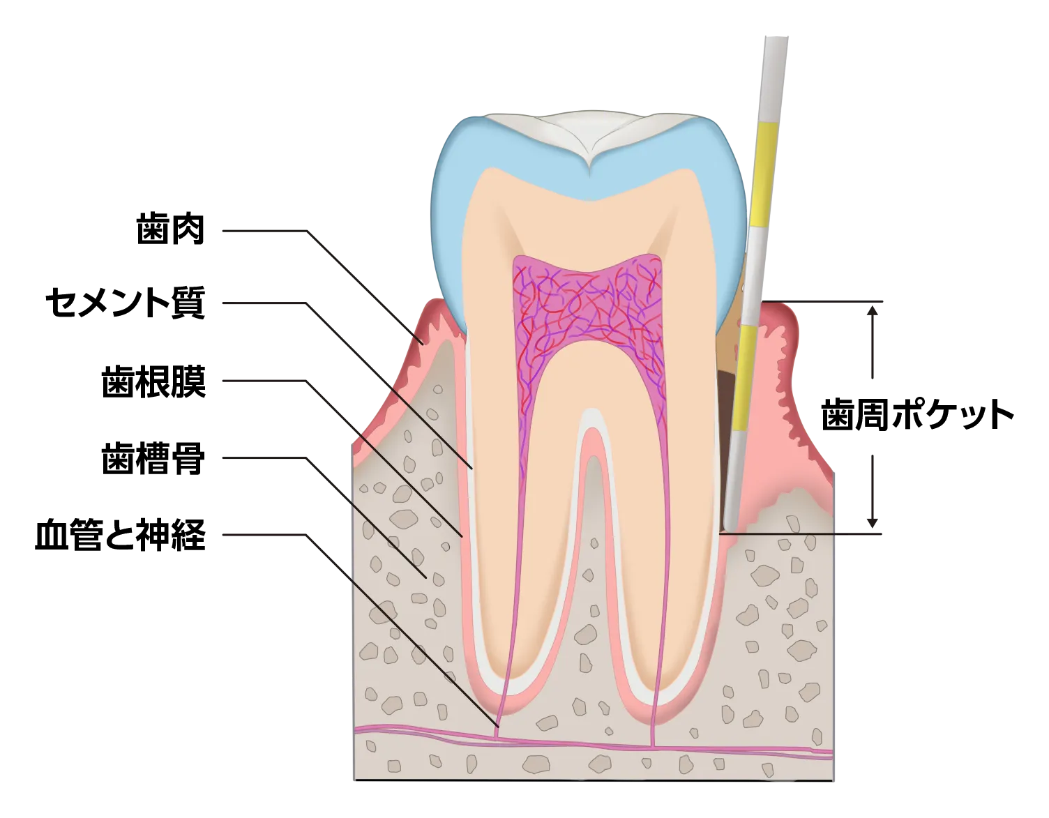 健康な歯茎ではポケットの深さは1~3mm程度ですが、歯周病が進行すると深くなります。
