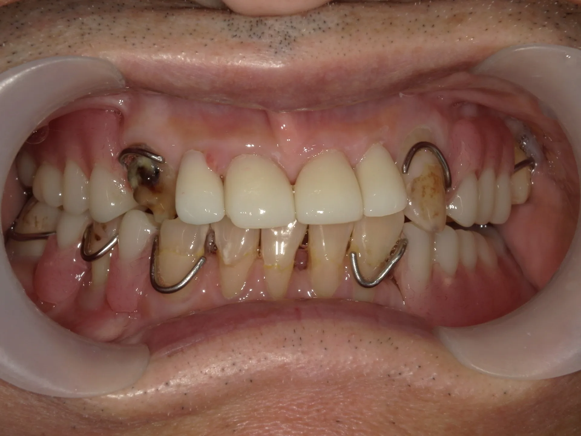 上の前歯4本は歯の根っこしかなく歯の頭は全くありませんでしたが、歯の根っこの中の治療を行ってから土台を立ち上げて、被せ物をはめています。奥歯は入れ歯をはめることによって高さを上げて上下の顎の間には歯が縦に2本分入るようになっています。