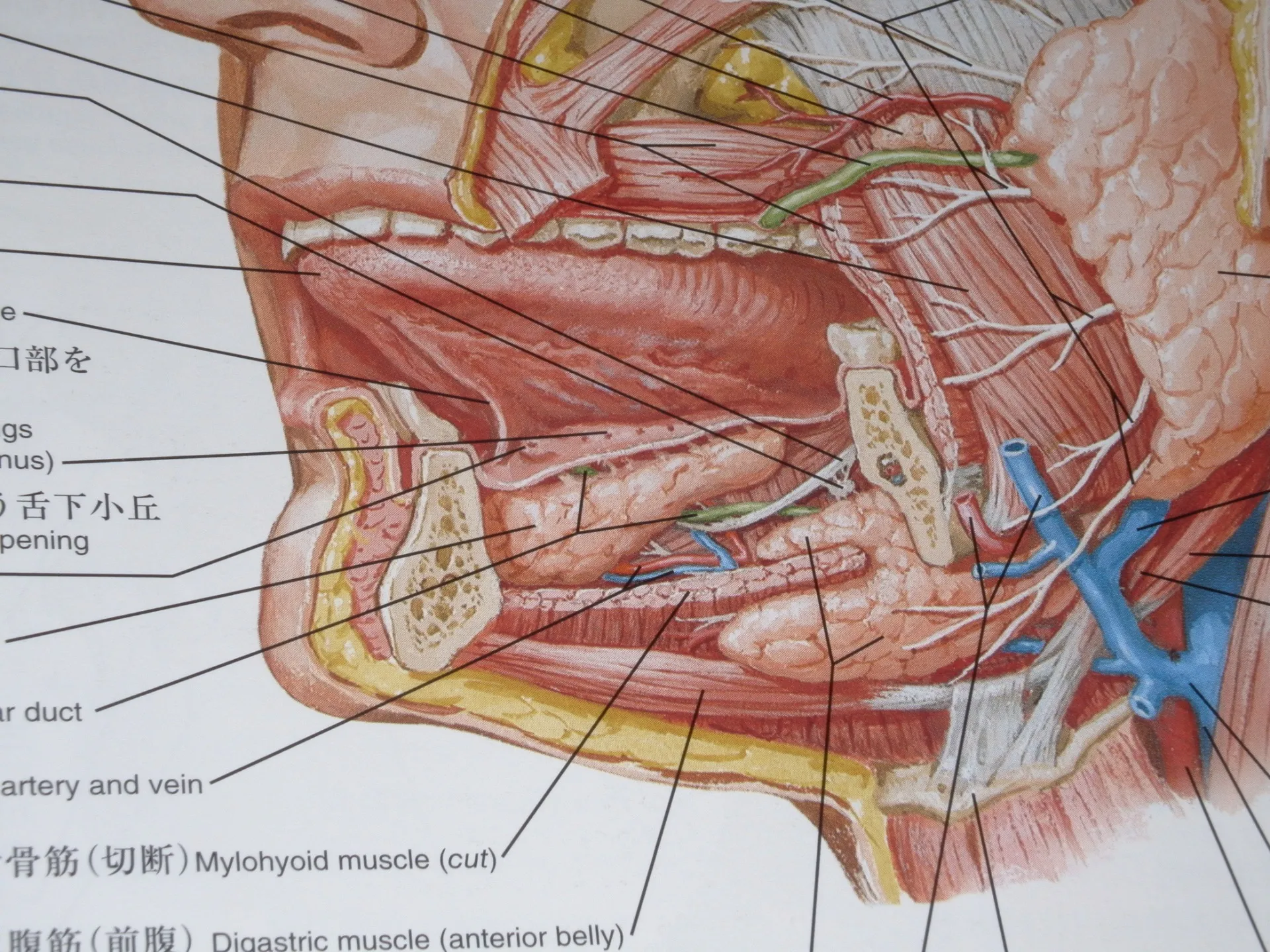 この解剖図では下あごを一部除去し舌の下の内部が確認できます。
